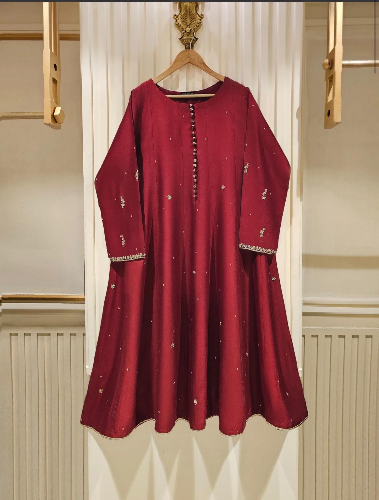 Shirt:Cotton Net Embroidered Frock Style (Attached Lining )*No sleeves lining*