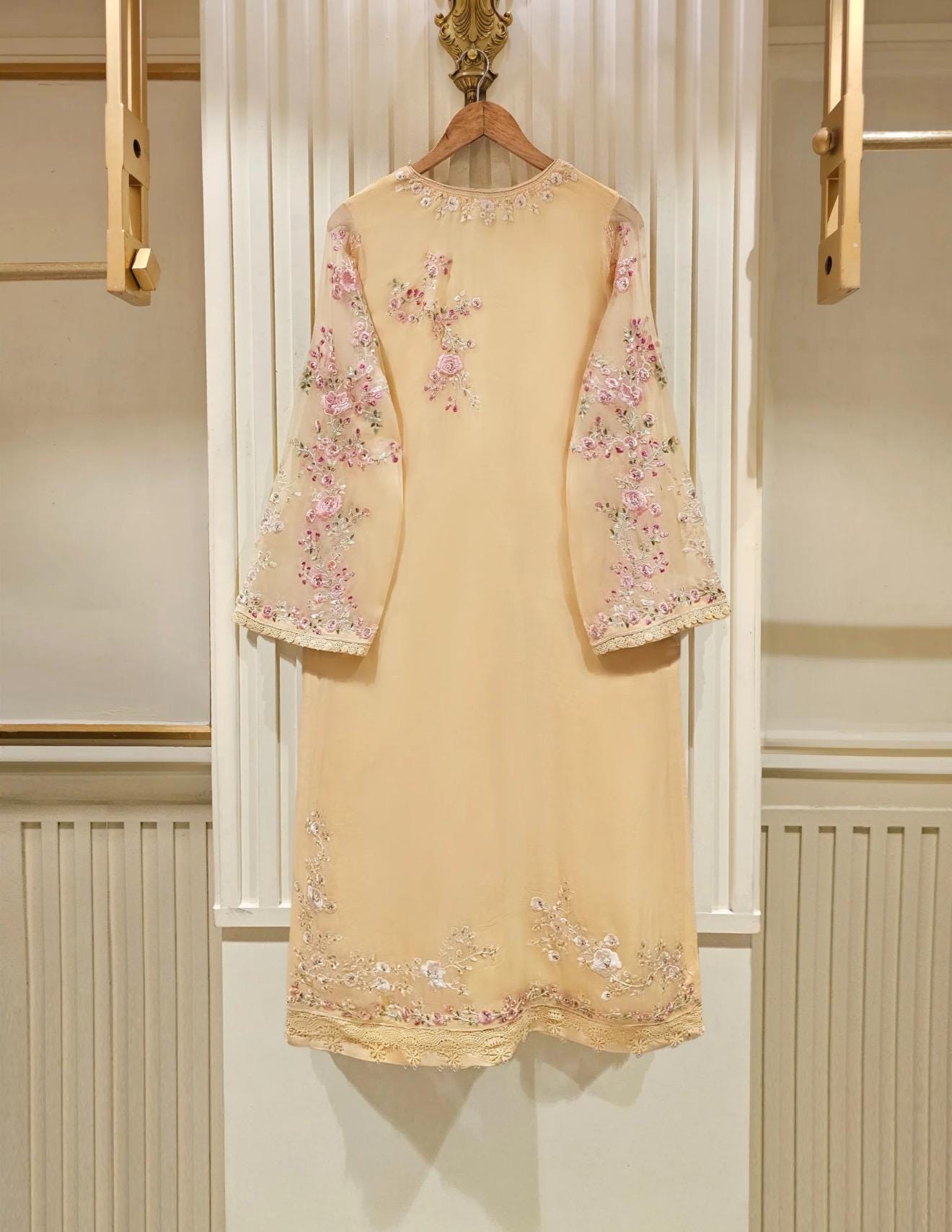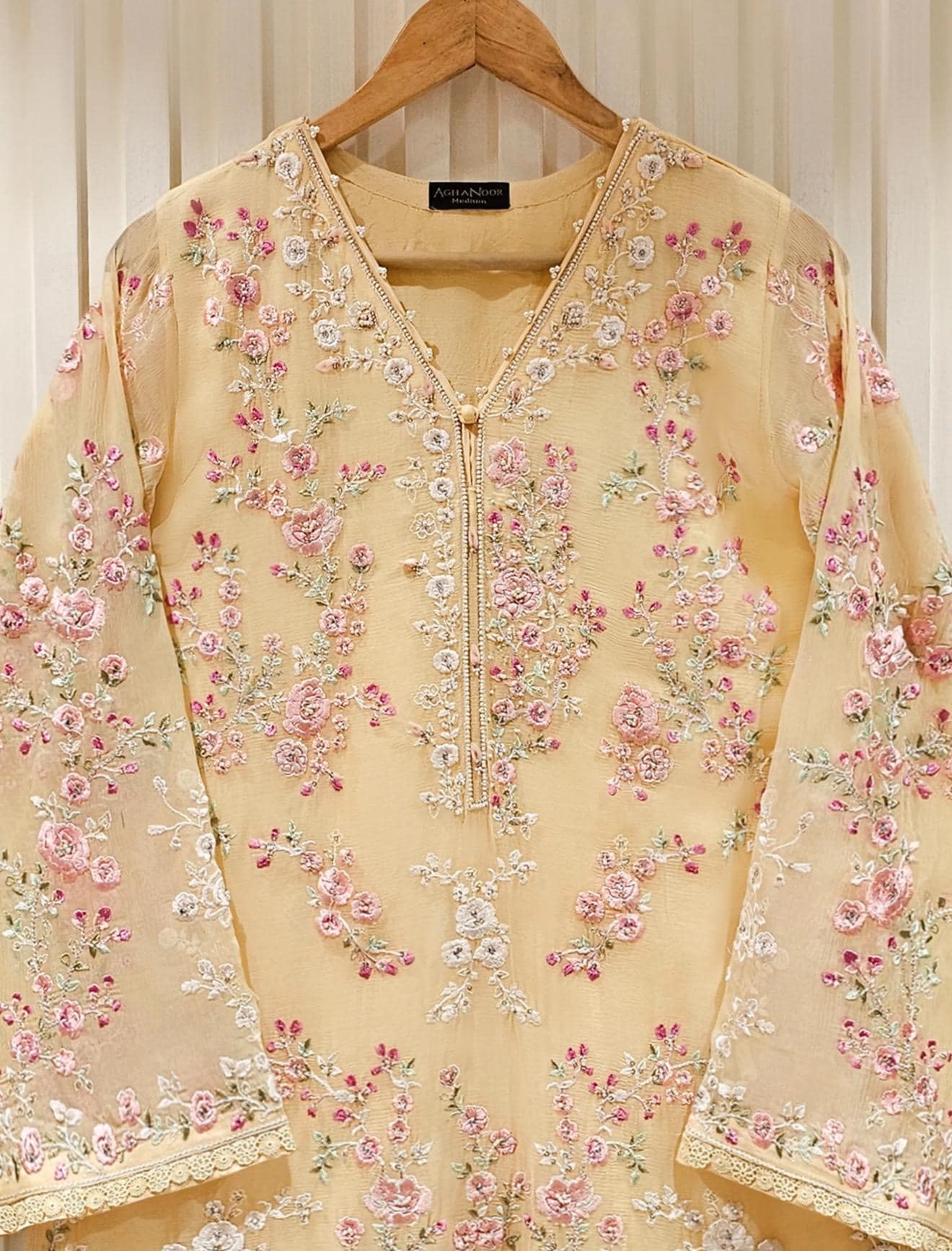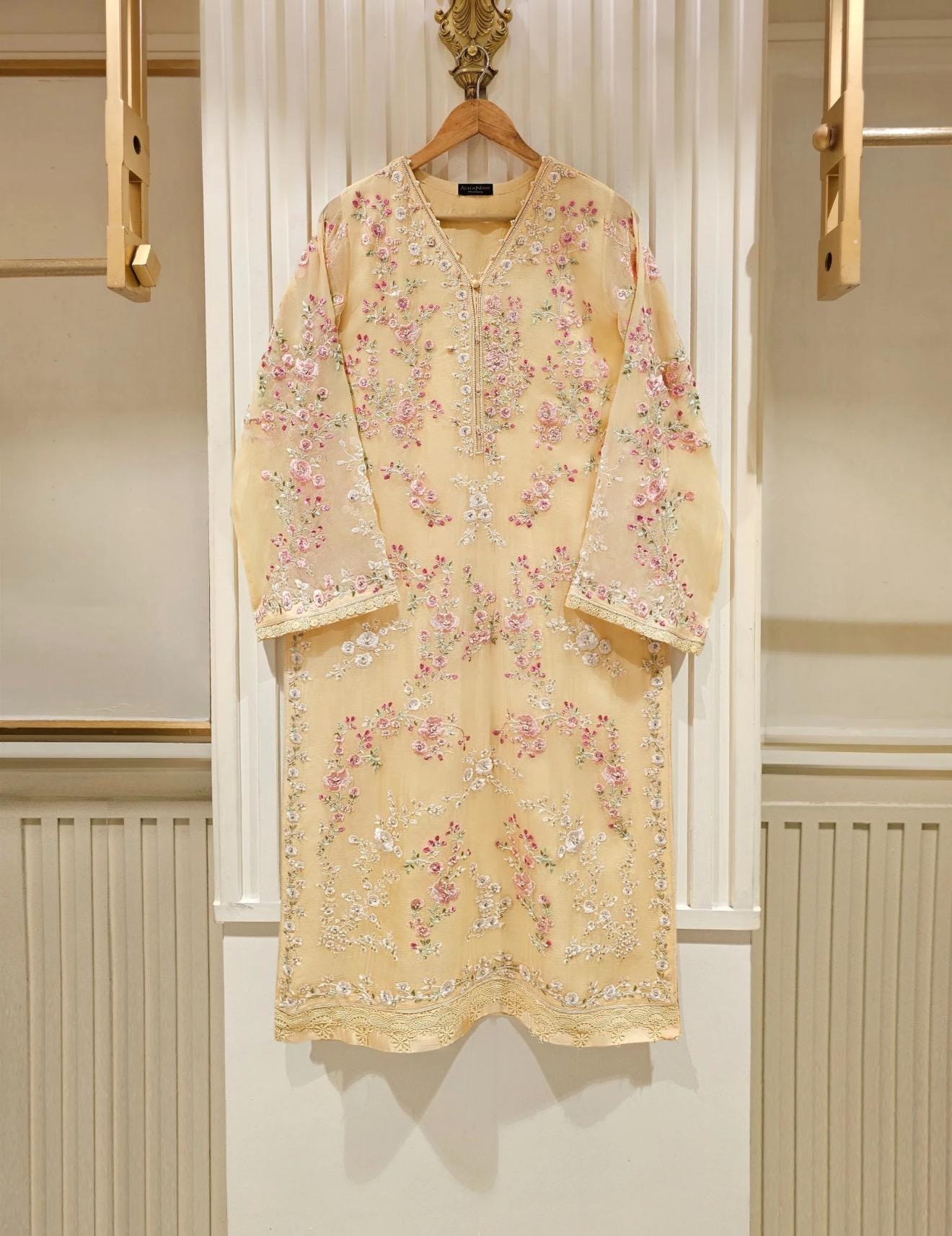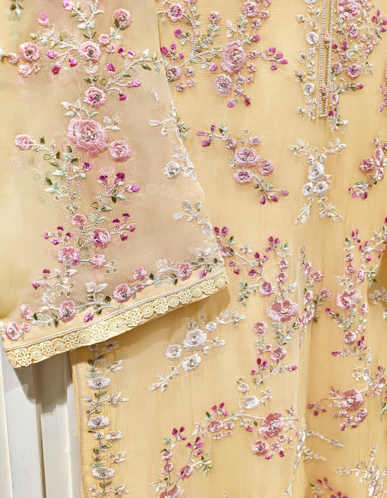 Shirt:Pure Chiffon Embroidered With Dabka beads and Sequins Work (Attached Lining )**No sleeves lining **