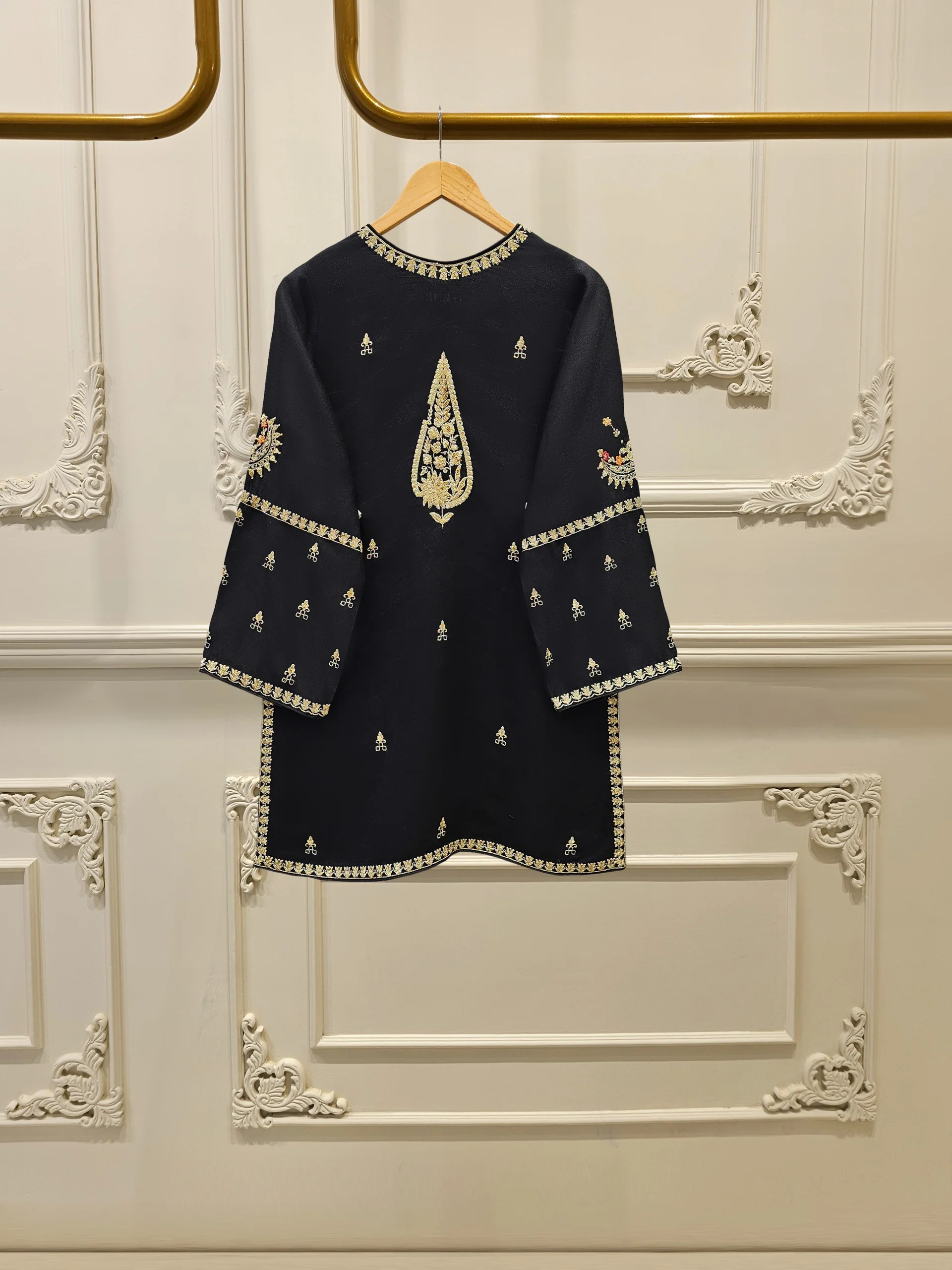 Dry clean recommended. Iron the clothes at moderate temperature. Do not use any type of bleach or stain removing chemicals