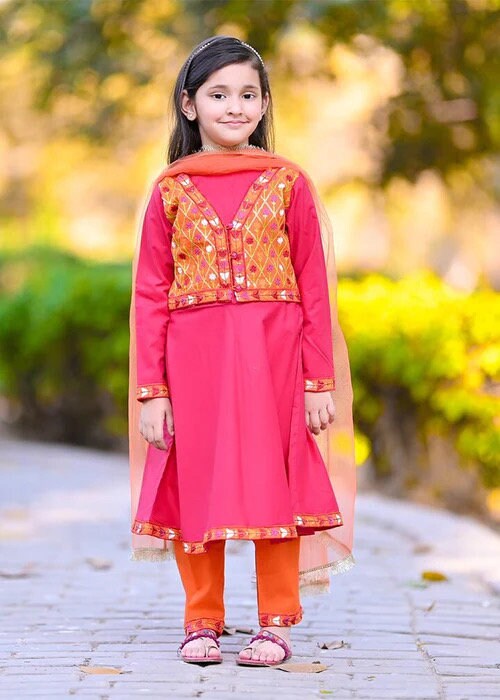 Description: This is stitched jacket style three Piece Dress . Fabric is Bareeza cotton/lawn. This 3 piece dress comes with Orange Net Dupatta