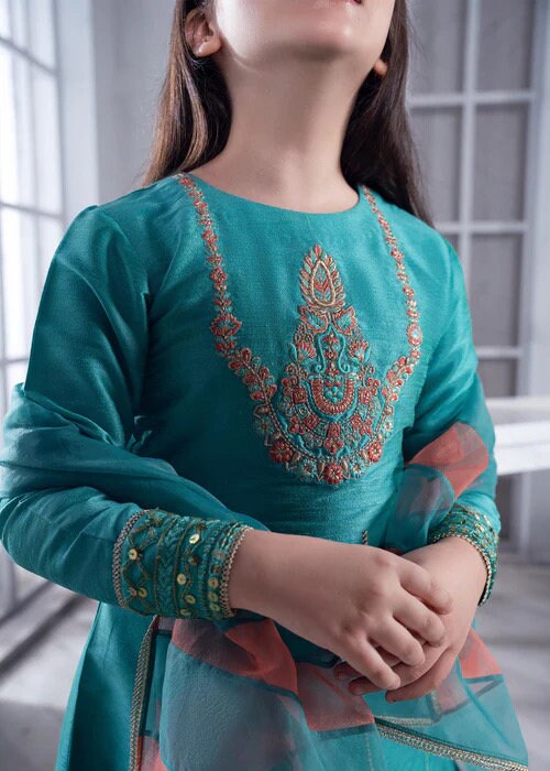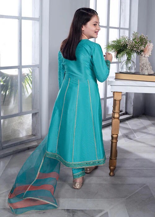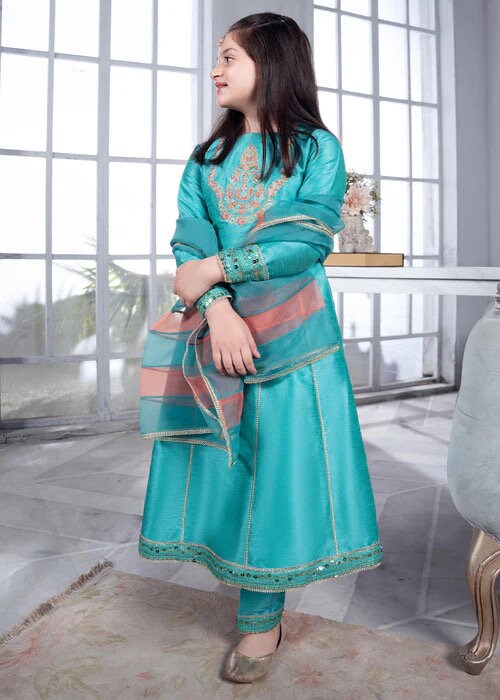 Sub-Category: Pishwas Package Includes: 3 Piece - Top Bottom & Dupatta Fabric: Kalidar: Raw silk Pants: Raw silk Dupatta: Organza Color Type: Tiffany Blue