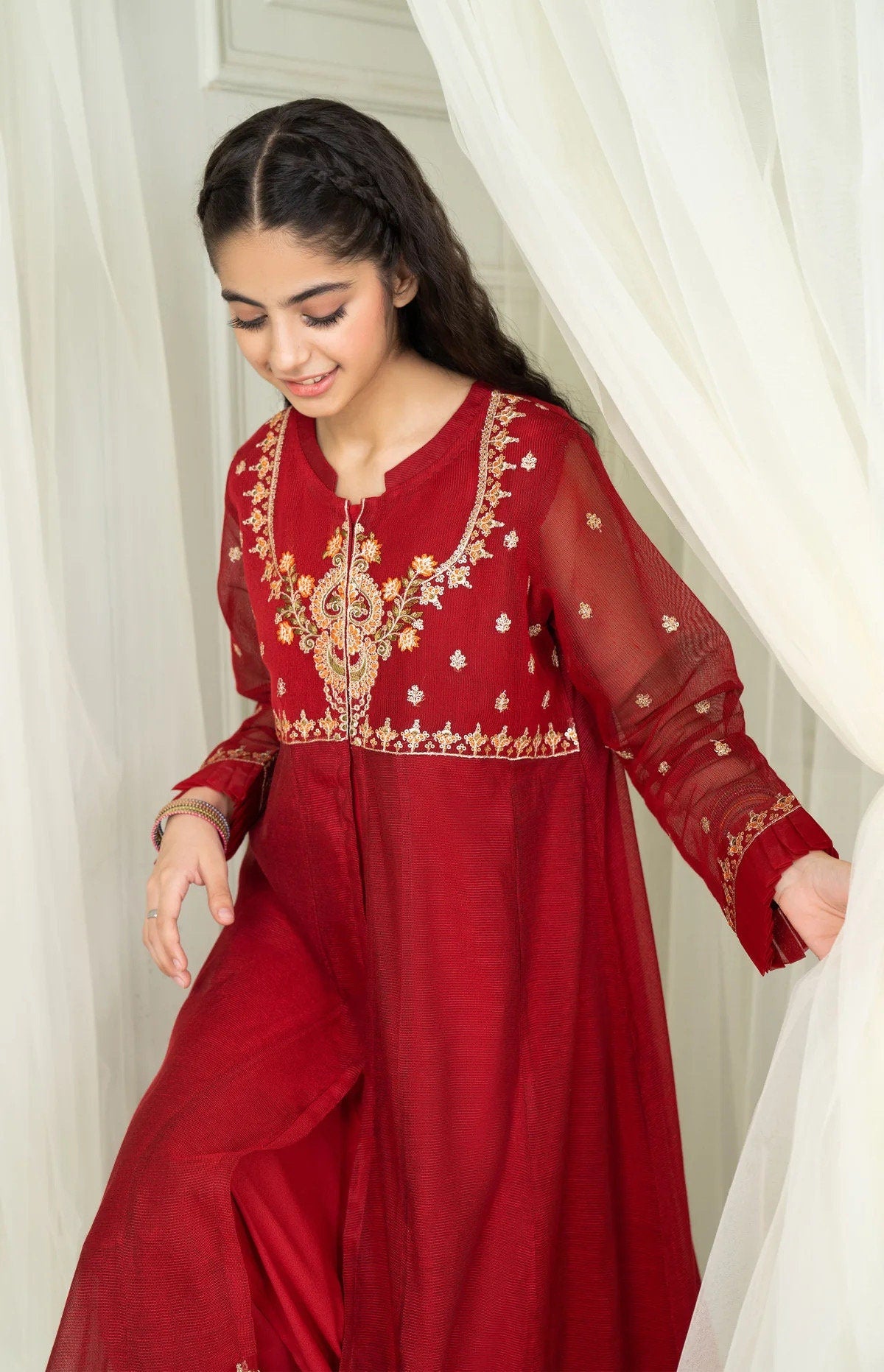 Includes: Goan Camisole Culotte Pants Color: Reddish Maroon Fabric Detail: Embroidered Khaddi Net Panelled Goan with embroidered organza Patti on the sleeves and the bottom Grip Silk Camisole Grip Silk Gharara pants