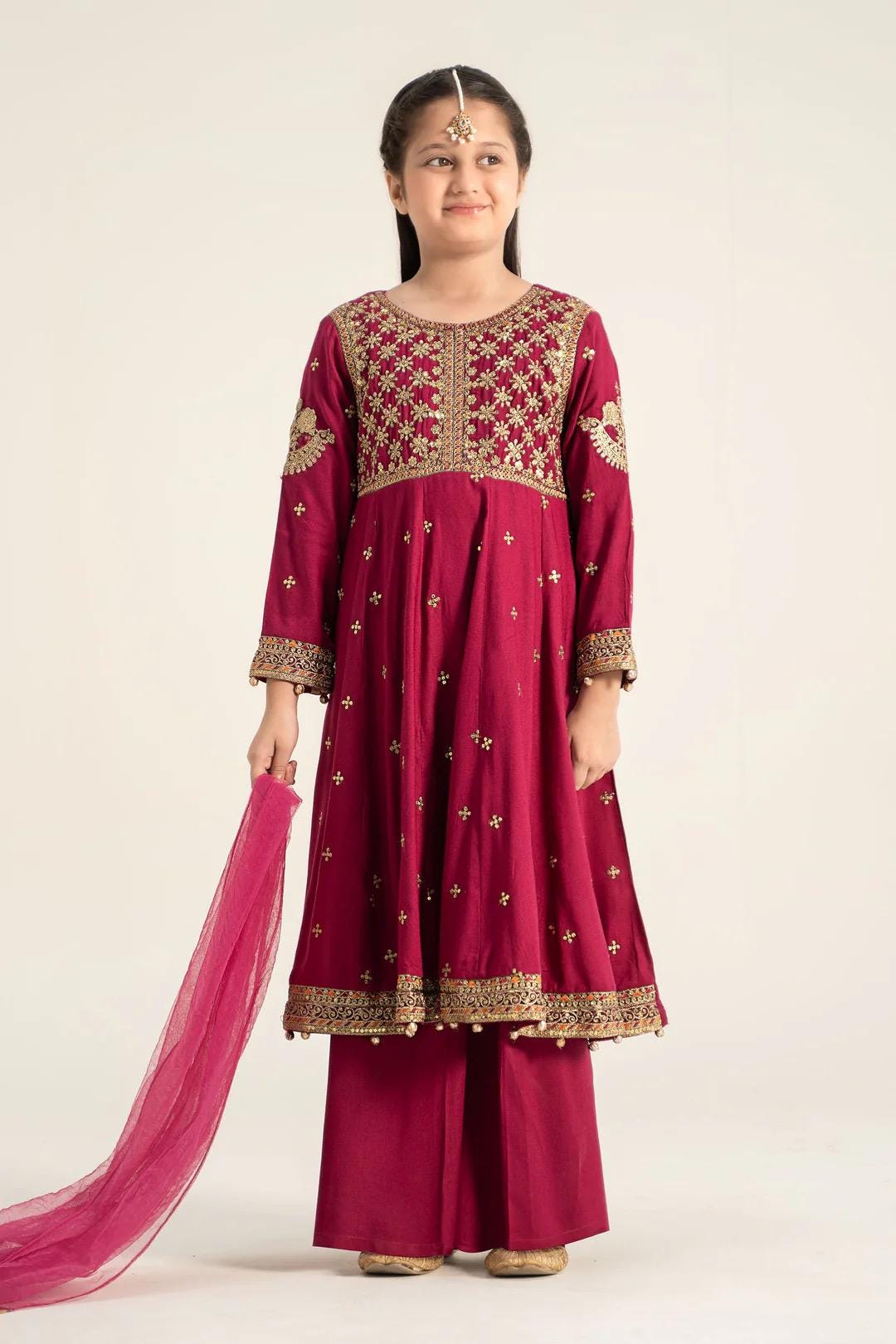 Frock Round Neckline Embroidered Bodice Spray Embroidered Silhouette Embroidered Border Embroidered Sleeves With Motif Gotta Balls Detailing On Sleeves & Border Dyed Back Fit: Regular Color: Magenta Fabric: Dobby Linen